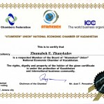 Сертификат о включении в Члены Национальной экономической палаты Казахстана “Союз”Атамекен” Жаныкулова Жумабека Есилбековича |