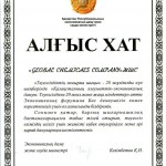 Благодарственное письмо от Управления делами Президента Республики Казахстан и Национальной экономической палаты Казахстана “Союз”Атамекен” за активное участие и помощь в строительстве Детского Дома для детей-инвалидов. |